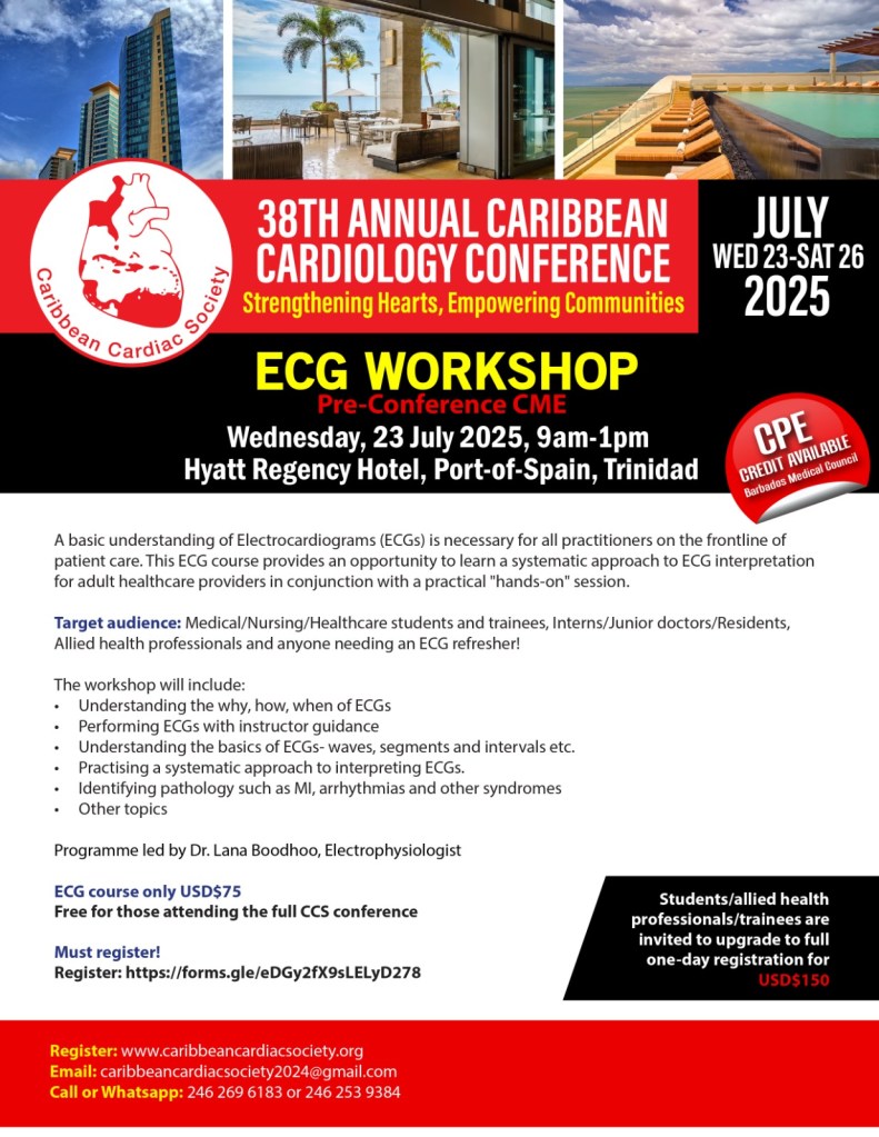 Our conference theme is: “Strengthening Hearts, Empowering Communities” and our audience will include Cardiologists, cardiac surgeons, internists, primary care physicians, medical students and other affiliated health professionals including nurses and technicians. On July 23 we will host an ECG Workshop aimed at the local medical community and an Interventional Round Table where we welcome inputs and discussion from various cardiac professionals from all around the world on the current issues arising. Our goal is at least 300 attendees, from Trinidad, the Caribbean region and beyond.